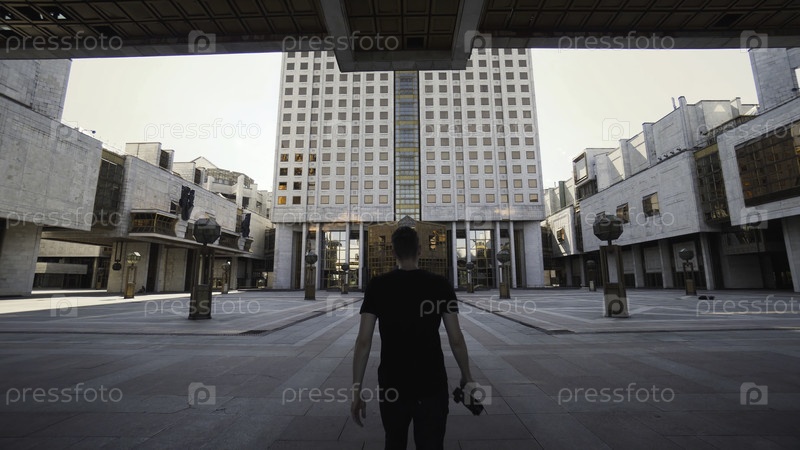 Мужчина фотографирует красивое современное здание в городе. Идите дальше. Профессиональный молодой фотограф снимает популярные современные здания. Обзор достопримечательностей России. Строительство РАС