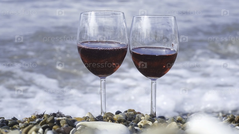 Два бокала красного вина на пляже среди волн.Концепция.Два бокала вина на пляже для романтического свидания.Прекрасные бокалы вина в море