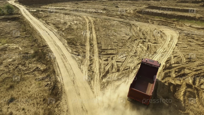 Грузовик находится на песчаной дороге до карьера. Сцена. Вид буксира, едущего по желтой грунтовой дороге в сельской местности. Большие грузовики в зоне строительства или карьере