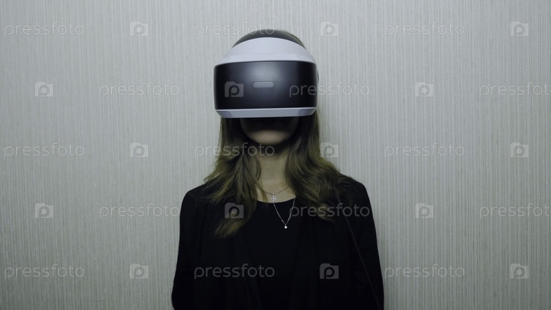 Удивленная молодая женщина касается воздуха во время виртуальной реальности. будущее уже здесь. привлекательная девушка настраивает VR-гарнитуру и улыбается, сидя дома