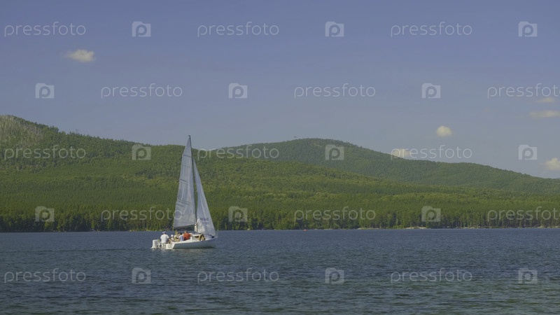 Любители ездят на лодке по озеру. Друзья вместе отдыхают на воде. Красивая природа вокруг