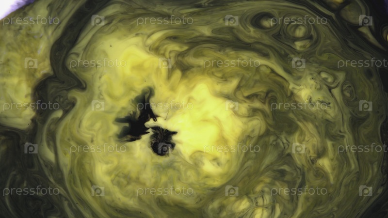 Многоцветные краски наливают молоко в узоры. Близкий план ярких цветных красок, капельничающих на поверхность белой жидкости. Красивые абстрактные полосы гладких цветов желтого и черного