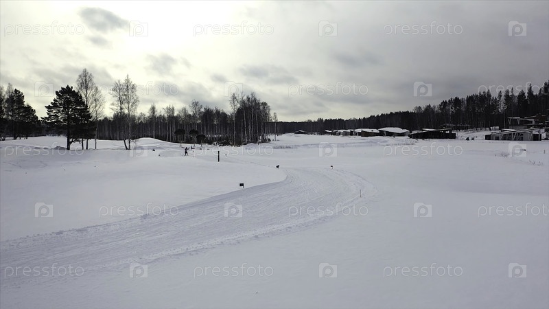 лыжные гонки на трассе зимой. кадры. вид профессиональных лыжников, соревнующихся в красочных костюмах на трассе. зимние соревнования по лыжному спорту