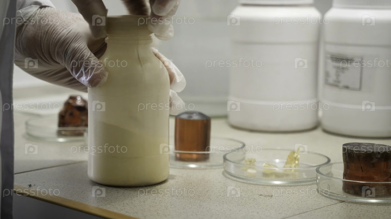Исследователь готовится к проведению химического эксперимента в лаборатории.Закрытие лаборанта в перчатках открывает химическую бутылку, когда он готовит химический эксперимент