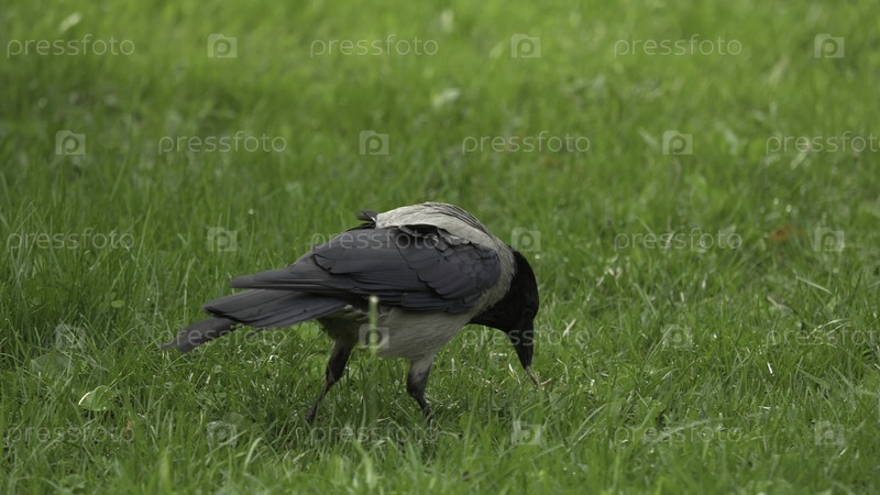 Ворона держит свой пищевой приз. Портрет черной вороны, воронки или башни. Черная джунгляя ворона стоит и ест кусок хлеба на зеленой траве. Одна милая ворона в капюшоне ест белый хлеб