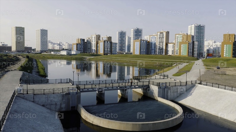 Екатеринбург, Россия, пруд с мостом в новом парке. видео. вид из воздуха красивого городского района с красочными многоэтажными зданиями на фоне синего неба