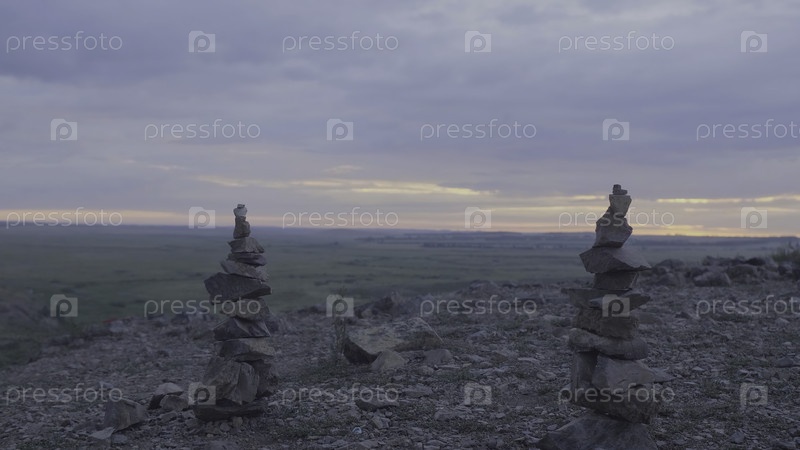 Песчаные камни Зенская башня и баланс. кучка камней против неба. каменная башня на фоне поля и утреннего неба