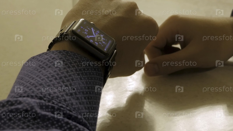 Красивый, стильный мужчина контролирует время на электронных часах.Молодой человек проверяет современные наручные часы