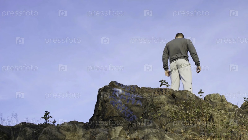 Мужчина-бегун расслабляется после тренировки, стоя на скале на фоне заднего неба