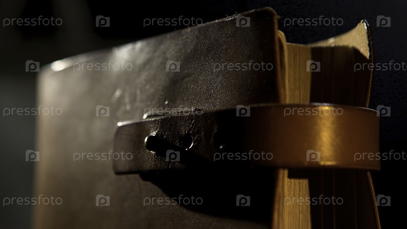 Винтажная кожаная книга с желтыми страницами. Резервные кадры. Закройте старинный блокнот коричневой кожевенной крышкой и ремнем в вертикальном положении, изолированным на черном фоне при слабом свете
