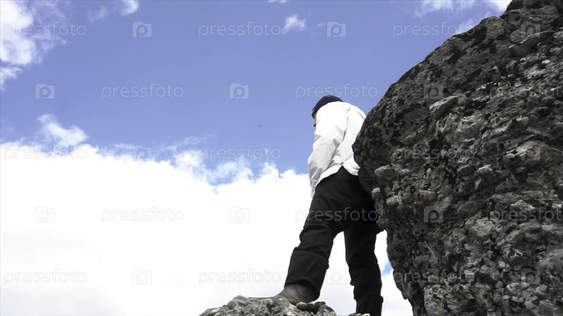 Человек в белом куртке стоит на вершине горы на фоне синего облачного неба, вид снизу