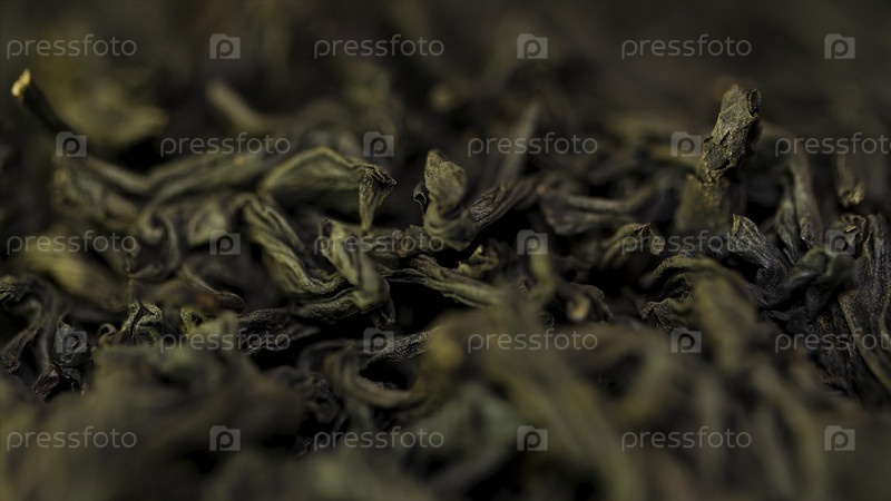 Текстура фона зеленого чая Сенча - свежий, сладкий и нежный чай. Чёрный чай на заднем плане. Много сухого черного чая, текстура. Макровыжатый