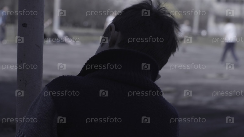 Одинокий мальчик сидит на скамейке и смотрит, как его друзья играют в футбол