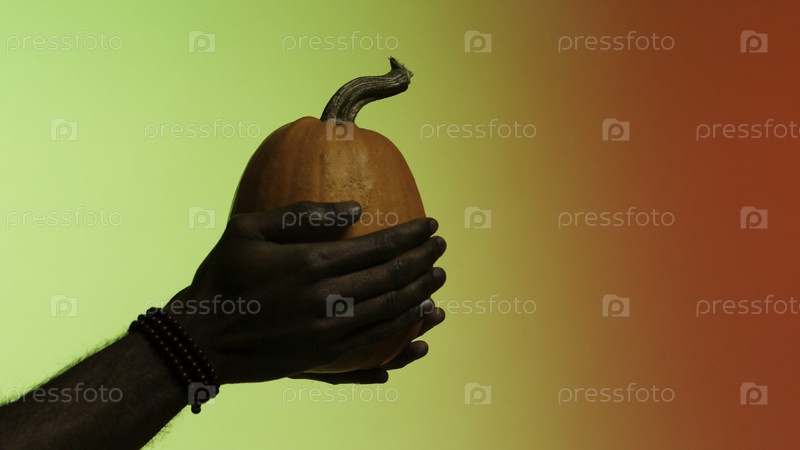 Афроамериканец дарит белому человеку спелую, яркую и сочную тыкву, изолированные руки на красно-желтом фоне