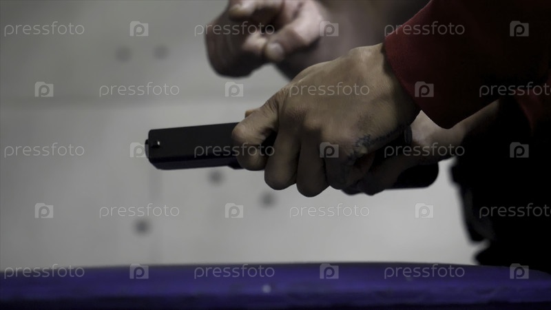 Тренер учит человека стрелять из пистолета. Покрыть руки мужчины оружием, человек тренируется стрелять. Специальное подразделение полиции в обучении, школа. Стрелок с коротким ружьём