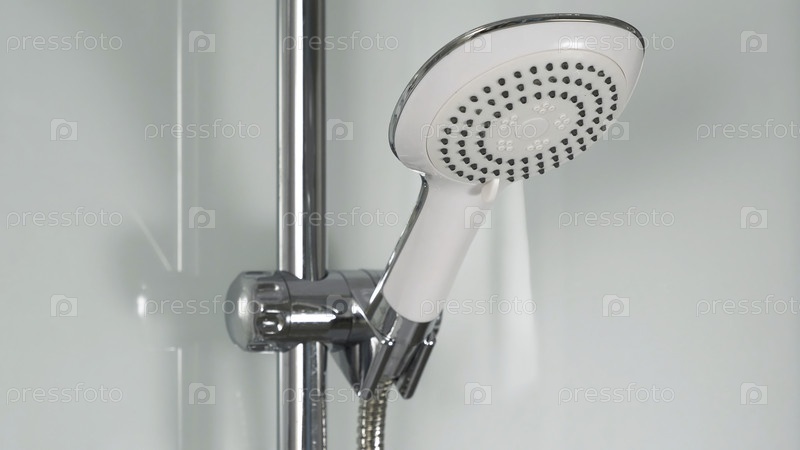 Кромированный душ. Душ для ванны на стене с белыми плитками. Душевая головка изолирована в 4K-белой душевой кабинке