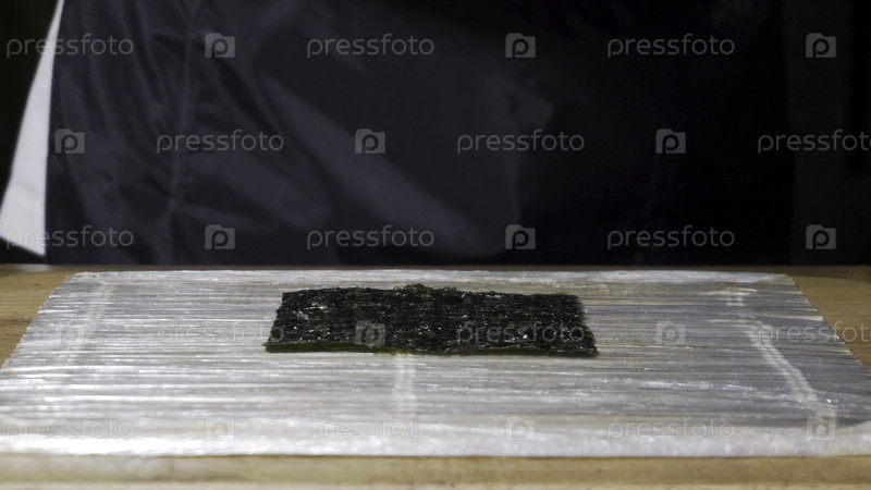 Покройте руки черными кухонными перчатками, при этом накладывая белый рис на нори - понятие пищи. Рамка. Мужчина прикасается к рису руками и начинает готовить суши