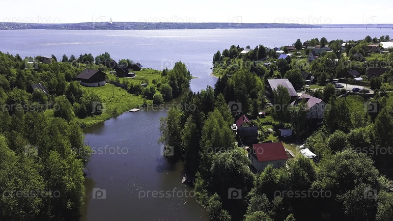 Потрясающий воздушный вид на лесистое побережье с небольшими коттеджами в солнечный летний день.Маленькая прибрежная деревня, красивые дома возле тихого моря
