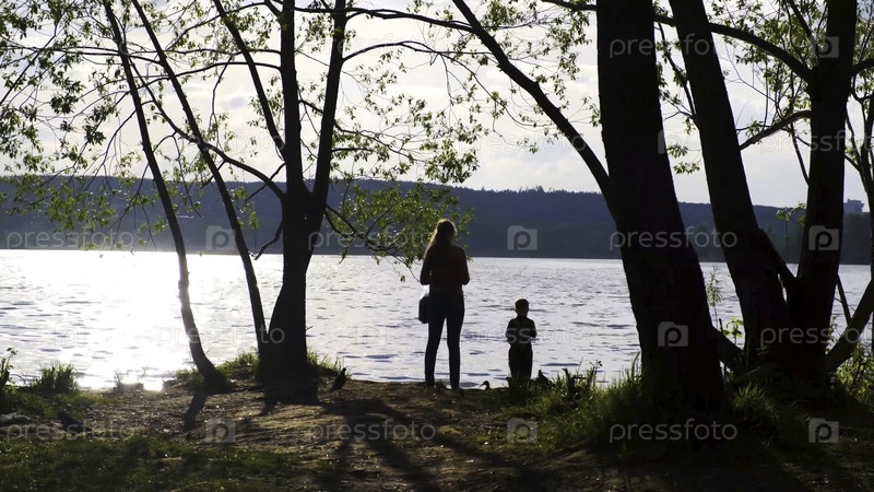 Мать и ее маленький ребенок стоят на берегу озера среди зеленых деревьев и уток в солнечный летний день, когда семья путешествует