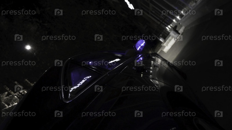 Закройте черную машину, припаркованную в городе ночью с различными светящимися огнями, концепцию ночной жизни