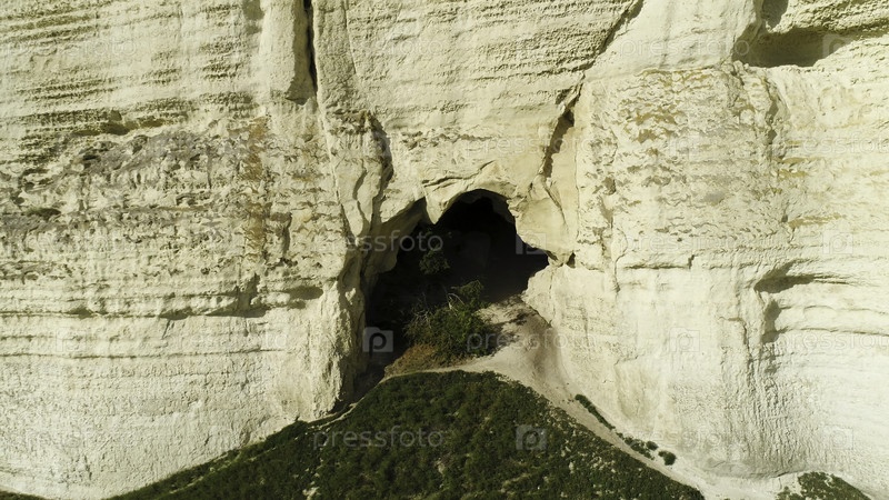 Воздух для небольшой пещеры с растущим внутрь деревом, летний ландшафт.Снимать.Разлом в белой скале, формы и формы природы