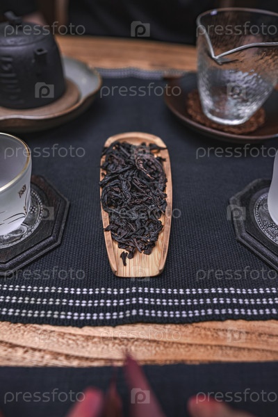 Спокойная сцена с нежными чайными листьями, элегантными блюдами и красивой керамикой для расслабляющего чаепития