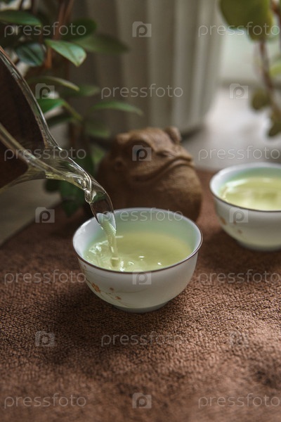 Нежный зеленый чай грациозно наливают в чашки, которые окружены красивыми спокойными природными элементами
