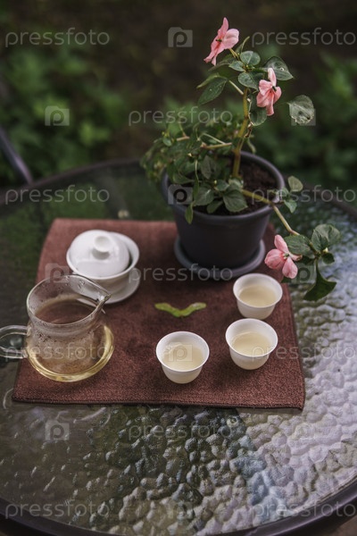 Найдите время, чтобы насладиться спокойным чаем с красивыми нежными стаканами рядом с ярким цветущим растением