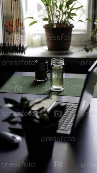 Уютное рабочее пространство с яркими растениями, элегантным ноутбуком и освежающими напитками создает теплую атмосферу приглашения
