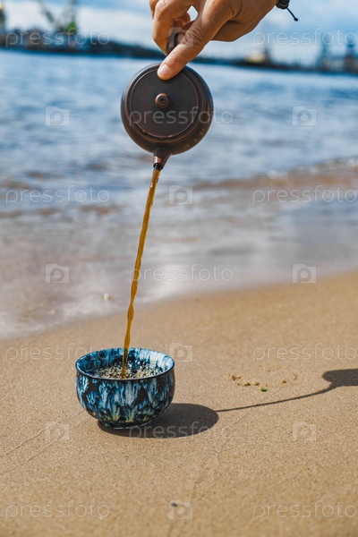 Налейте прекрасную чашку чая у берега в красиво оформленной голубой миске, наслаждаясь моментом