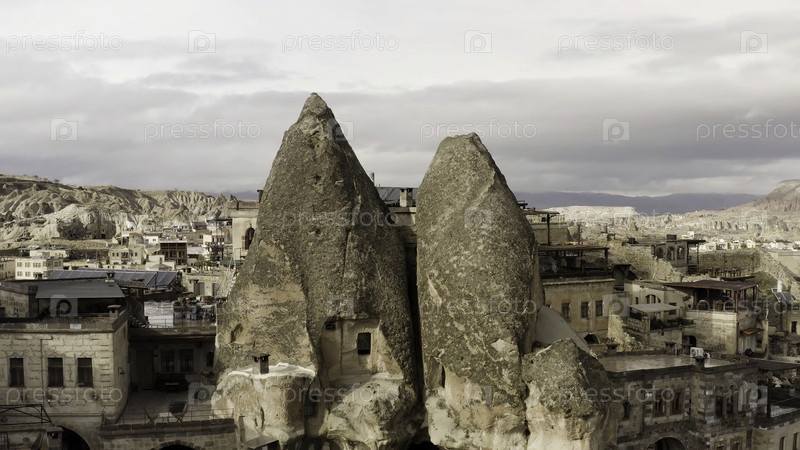 Древние каменные жилища, высеченные из туфа в Каппадокии (Турция).Продолжайте.Вид с воздуха на необычайно красивую природу, скальные образования, город и облачное небо