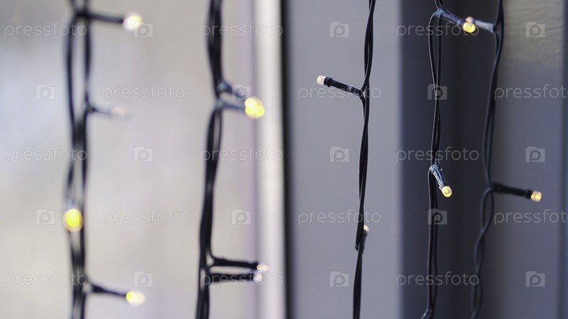 Звездная гирлянда с боковыми огнями на заднем плане. Рождественская витрина украшения гирлянды, концепция скандинавского стиля. Гирланда у окна. Новогоднее настроение