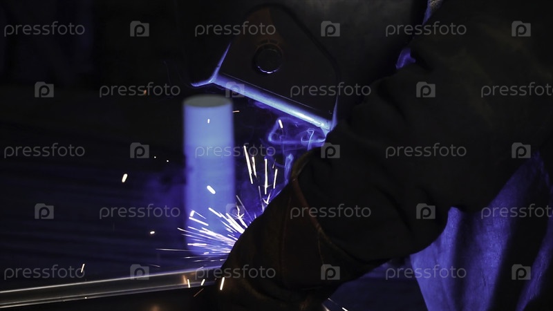 Мужчина работает с сварочной машиной. Клип. Сварка стальных конструкций на фабрике. Красивые искры вылетают