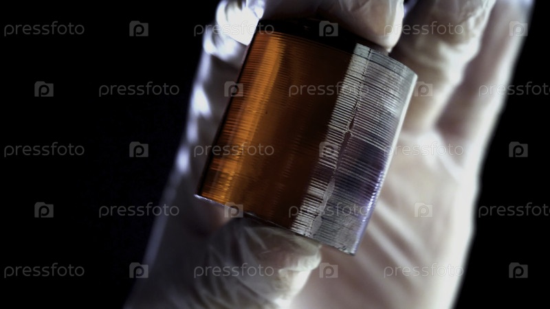 Рука, закрывающаяся в перчатках и держащая кусок обработанного янтарного минерала на черном фоне