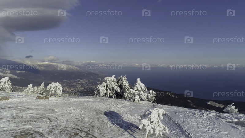 Вид с воздуха на заснеженные горы, море, облачное небо.Снимать.Заснеженные холмы у моря