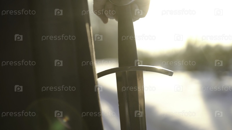 Человек в средневековом костюме с мечом. Продолжайте. Близкий план руки мужчины в средневековом костюме со рукояткой меча на фоне солнечного света. Эпический взгляд на средневекового героя
