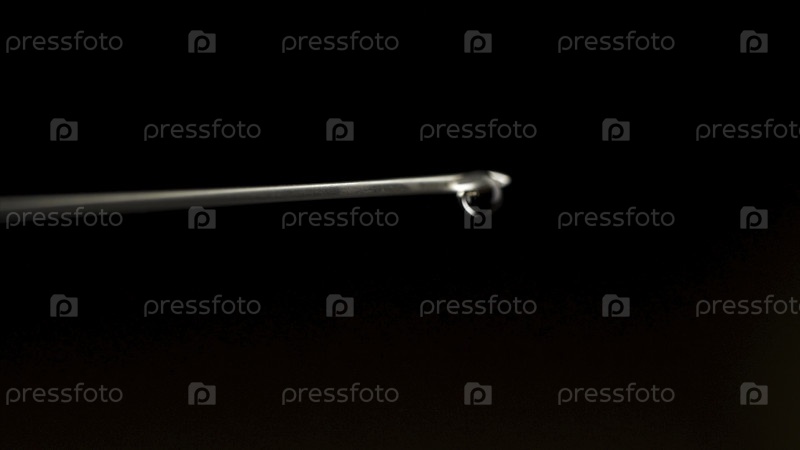 Клубовый снимок иглы шприца с каплей, изолированной на черном фоне. Вода капает из иглы шприца. Закройте ее. Замыкание медицинского шприца с лекарством