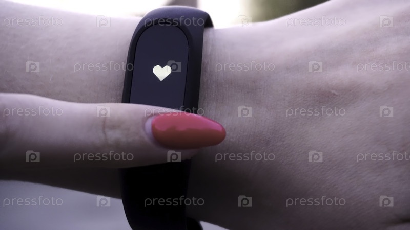 Девочки носили фитнес-браслет.Девушка проверяет пульс на фитнес-браслете или педометре от трекера активности на запястье, спорт, технологии и концепцию здорового образа жизни.Посмотрите на педометр. гаджет