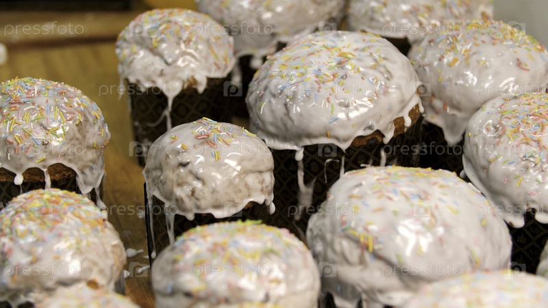 Закрытый к традиционным пасхальным пирогам из ремесленной бумаги, стоя на деревянном столе, концепция еды и кулинарии. резервные кадры. дома сделали пасхальные торты с белой глазурью на коричневом столе