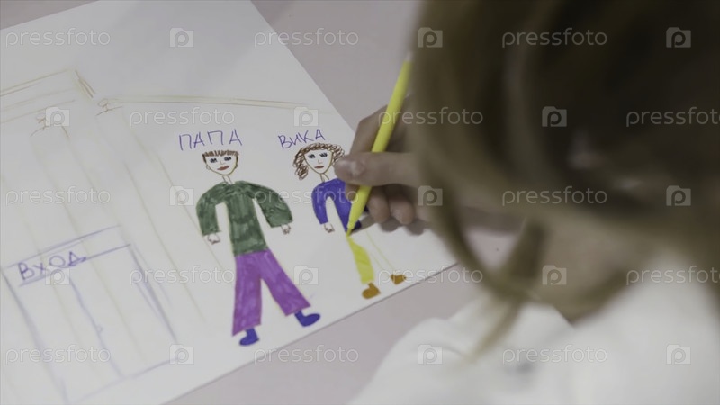 За плечом - вид маленького блондинского ребенка с кудрявыми волосами, рисующего человека с цветными карандашами.Искусство.Маленькая девочка нарисовала свою картину на белой бумаге, семейная концепция