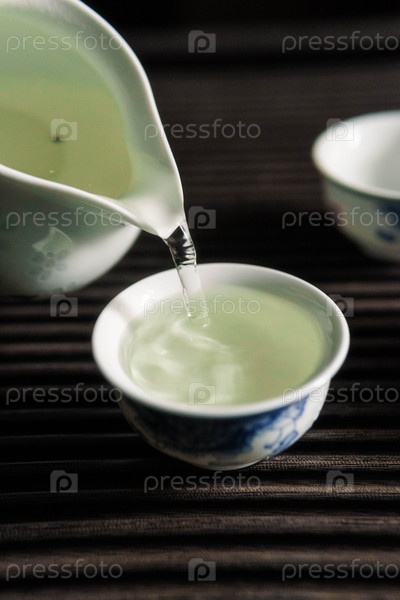 Спокойный момент разворачивается, когда чай наливают в нежные фарфоровые чашки, демонстрируя богатую китайскую культуру чая