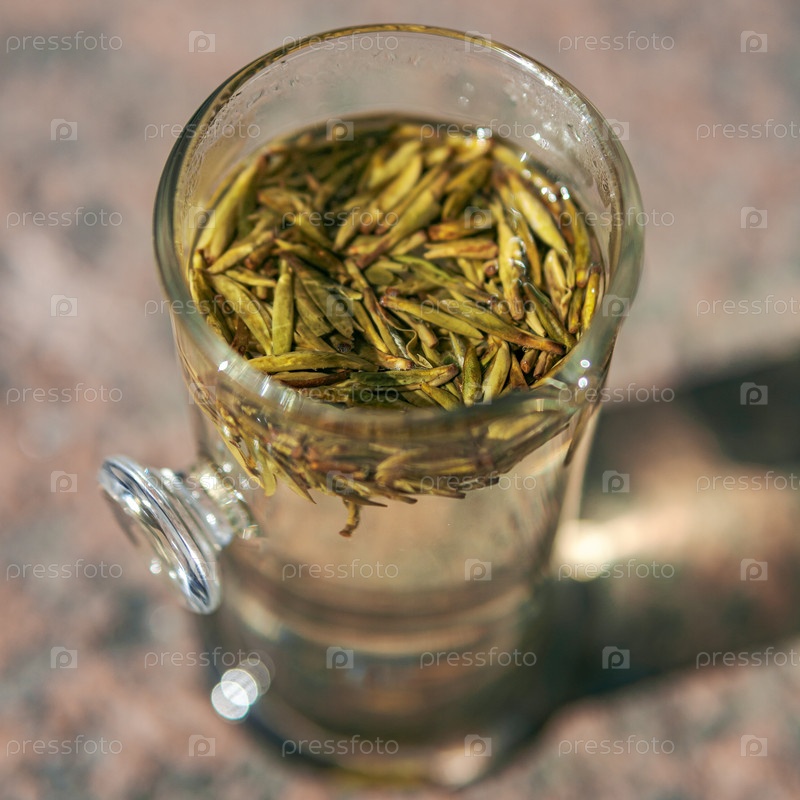 Нежная стеклянная чашка, наполненная ароматными листьями зеленого чая, демонстрирующая освежающие ароматы природы в каждом глотке