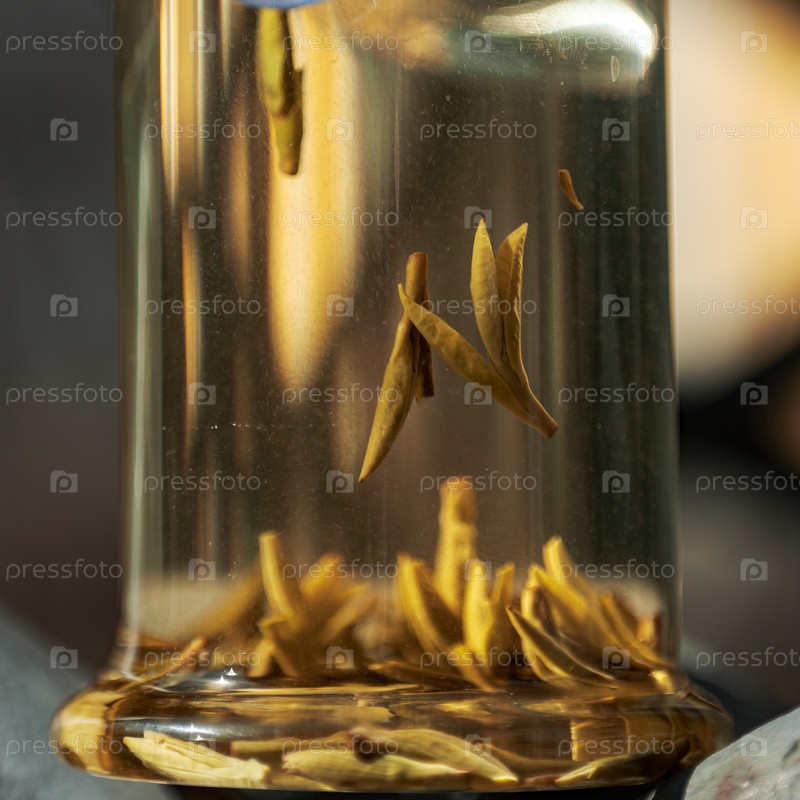 Золотые чайные листья грациозно скручиваются внутри хрупкого стеклянного чайника, красиво демонстрируя успокаивающий процесс заваривания