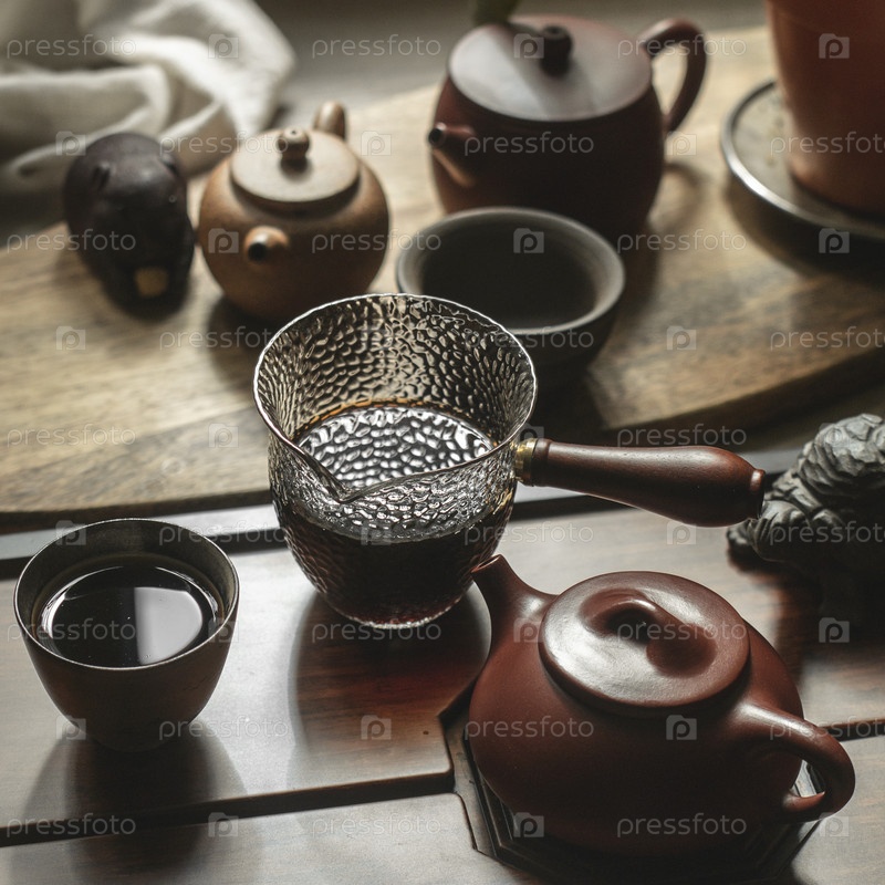 Спокойная и элегантная композиция чая со сложными чайниками рядом с красиво спроектированным потолком для чая