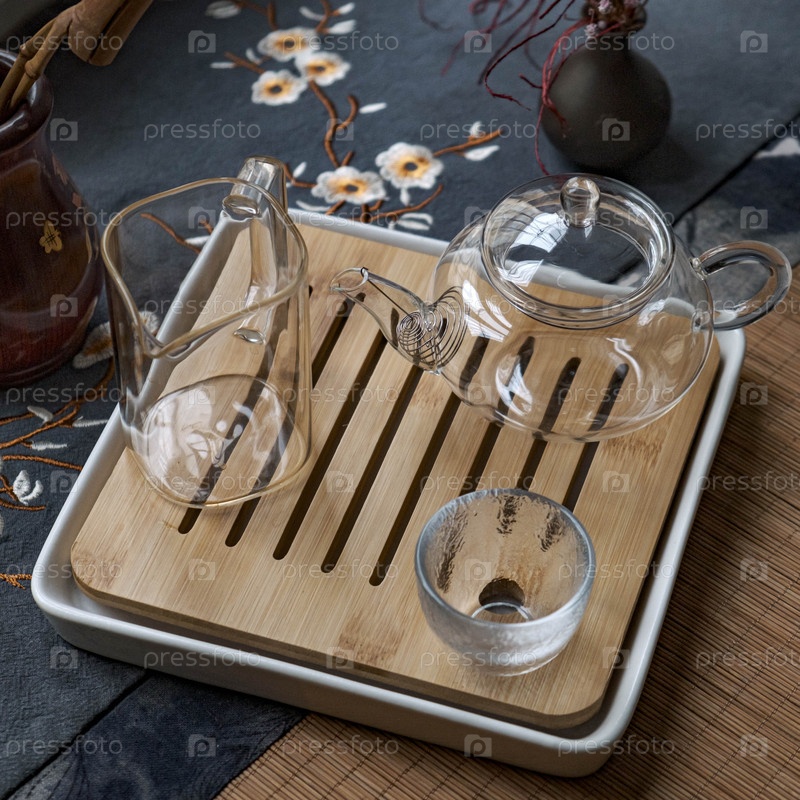 Элегантный стеклянный чайник вместе со своими аксессуарами красиво представлен на бамбуковой подноске