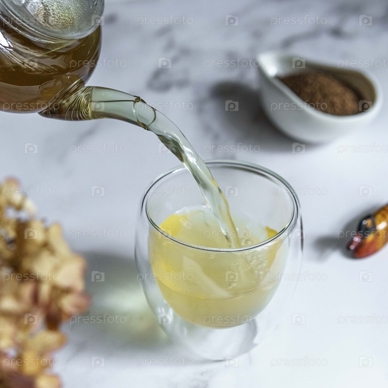 Потрясающий вид на ароматический травяной чай, изящно залитый в прозрачное стекло, окруженный ароматными специями