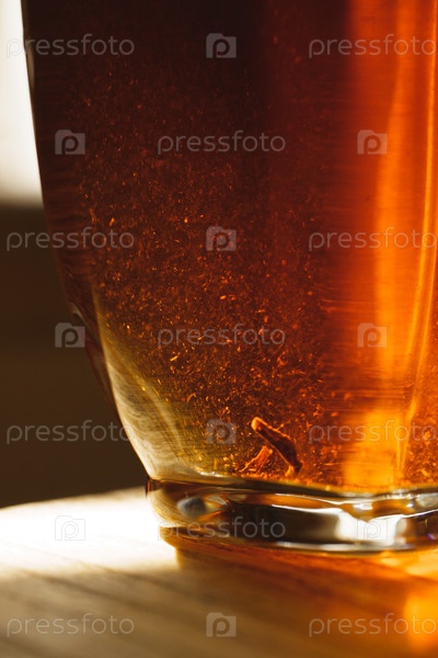 Близкий план янтарного пива в стакане, подчеркивая его богатый, яркий цвет и искрящуюся, приглашающую текстуру