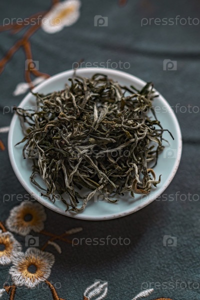 Красиво устроенные премиальные листья зеленого чая изысканно выставлены на декоративной плите