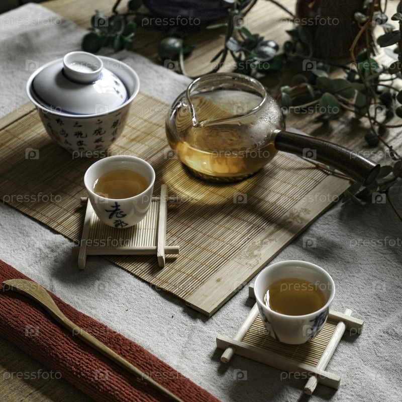 Элегантная настройка чайной церемонии с красиво выполненными традиционными блюдами и аксессуарами