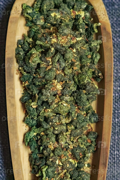 Красивые зеленые чайные листья уolong умело расположены с осторожностью на прекрасно выполненной деревянной тарелке